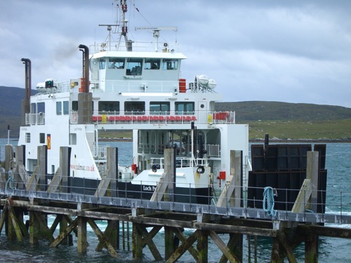 We returned to the slipway to await the ferry and boarded the Loch Portain just after midday. The crossing was breezy and very pleasant as the ferry zigzagged through red and green buoys on a slalom course along two sides of a triangle. A fellow passenger told me that the ferry had run aground on a sand bank previously.We disembarked at Leverburgh and I stopped at a tea shop for tea and carrot cake and to get my water bottles filled before setting out. The lovely coastal scenery was spoiled only by the low cloud, mist, drizzle and wind. I had planned to stop for the night at Luskentyre on the dunes but I arrived there quite quickly and with the weather closing in, I decided to press on to Tarbert. The road ascended in a series of climbs over a pass. I passed a couple sheltering from the rain in a bus shelter, their bikes parked outside. The cycling couple passed me whilst I sheltered under an overhanging rock to eat a US MRE meal of beef and potatoes warmed with the flameless heater. The rest of the climb was strenuous for a novice cyclist and reaching the top did not provide much relief due to the deadfall conditions. I overtook the couple and the sharp descent into Tarbert did not come too soon. Application of factor 25 that morning seemed highly optimistic. Exhausted, I went to the Tarbert tourist information office to find a bed for the night, spirits being at an all time low. The place was busy and whilst I dripped all over the carpet at the centre of a growing puddle, the woman was trying her best to find accommodation for a group of thirteen all over the island - I didn't hold out much hope. In the end there was no room at the inn and all she could offer was a patch of lawn to pitch a tent in Angus's garden. Discouraged I set off again up the coast against a now howling gale and driving rain. I was cold, tired, disheartened and looking at the prospect of either pitching a tent who knows where or the highest steepest climb of the journey over the infamous Cliseam, the part of the trip found the most incredulous by the party on the beach on Saturday night. It wasn't looking good, hypothermia was a real and present danger.