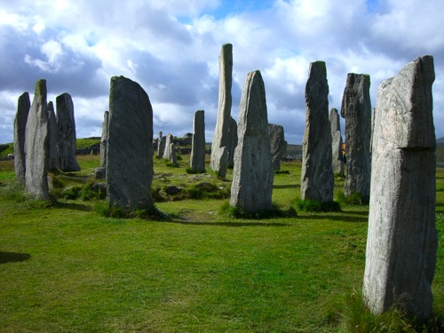 Outer Hebrides - 2007Lewis, Harris (22 miles) - Wednesday, 1 AugustIt rained several times during the night and fortunately the trees gave good shelter from the wind. The wet things I'd hung in the porch of the tent were still there and still wet, worst of all this included my trainers which were now home to three slugs.It was 7.30 am and I knew I couldn't sleep any more. My sunburn from Sunday was still hurting ironically plus the bumpy ground made further sleep impossible. Slowly I got my spirits back in order. I ate breakfast, made a mug of tea and found dry clothes to put on. I put all the wet things in one front pannier and transferred the dry clothes to the other. Everything packed I removed the slugs and put reluctant feet gingerly into the trainers. Amazingly they didn't feel that wet, the 'Event' fabric was obviously doing its job. The bike loaded up, I pushed it back to the road and left the gate tied up as I'd found it. Within minutes I was back again into a headwind and showery rain, but eventually I coasted into Calanais, the aim of the current leg of the excursion. I made my way to the Standing Stones Visitors' Centre and walked round to the right to find the stones. On a slight rise, the stone circle was an impressive sight with fine views all around. These stones being 5,000 years old, predate stonehenge, the pyramids and almost everything else in the world. The stone circle projected out on one side to form more of a celtic cross shape, the 'avenue' of stones being as impressive as the circle. |