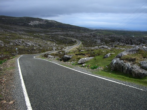 Outer Hebrides - 2008Harris to Lewis (58 miles) - Tuesday, 3 JuneA windy night with heavy showers gave way to an overcast morning with drizzle and wall to wall cloud, such a shocking change from the glorious sunshine of the day before. It was 9.30 am before the rain eased so by 10.00 am I was dressed and making breakfast. A few blue gaps appeared in the cloud and the rain finally stopped, giving a window of opportunity to pack up, stuff a very wet tent into its bag and ride off out of Roghadal.The coastal scenery of South East Harris was stunning, a rocky landscape interspersed with small villages. This time the wind was from the south and provided assistance along the tarmac ribbon that threaded north east on its roller-coaster route through Precambrian Lewisian gneisses. |