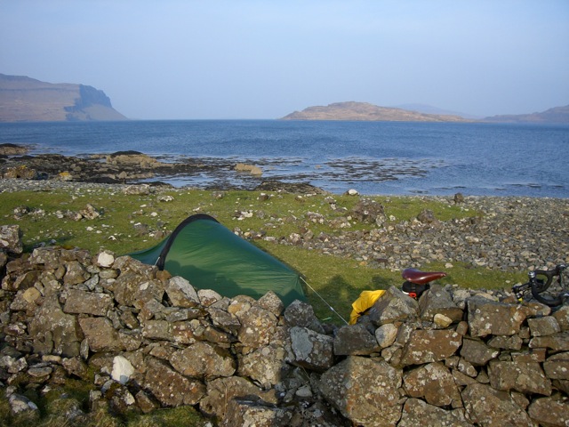 The light changed, casting an orange hue over the hills with the sun reflecting its rays across the sea. At 7.00 pm, the tent was up at a gorgeous loch side spot by Scarisdale Point. I watched as the sun set over the sea whilst listening to Radio 5 and drinking freshly brewed coffee.