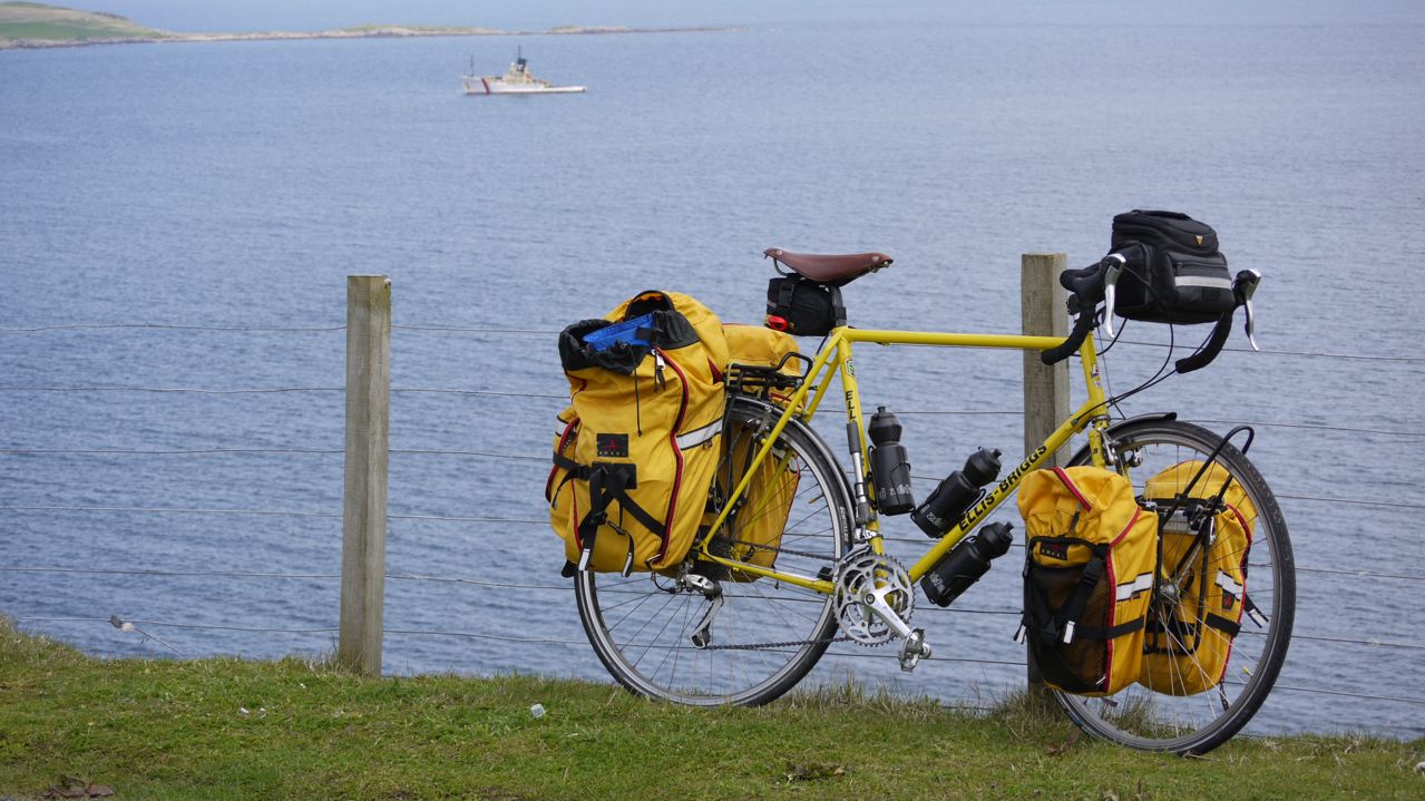 Most notably was near Sandwick where the Isle of Mousa and its Iron Age Broch could be seen clearly. Further north I diverted to follow the national cycling route through Mail, Aithsetter and Fladdabister. With a long enjoyable sweep past Easter Quarff then on to Brindister, soon I was back at the 'Ward of Wick' junction for a third time. A few climbs later, I reached the outskirts of Lerwick.The sun was shining as I navigated my way to the harbour and left the bike in the car park for a while and mooched around the shops. I made it back to the ferry terminal at 3.30 pm and recovered my spare clothes bag from left luggage. I met Jen, one of the Viking volunteers in the terminal and she very kindly offered me some medication when it became apparent that I'd totally lost my voice. I spoke (whispered) to another touring cyclist who was waiting in the terminal. He was Dutch and had cycled from Lands End to John O'Groats, across Orkney and then the length of Shetland. It was a privilege to witness the end of his impressive journey, he asked me to take his picture. Loading started at 5.00 pm and the Dutchman and I cycled round through vehicle check-in to wait in line on the dock. Neil arrived and so did the BTCV volunteer minibus. I had to dig out my hat for protection against the hot sunshine. Eventually on board, the MV Hjaitland left on time steaming out of a sunny Lerwick. I had the same meal of meat and vegetable pie in the restaurant and retired early, for a very comfortable night's sleep.