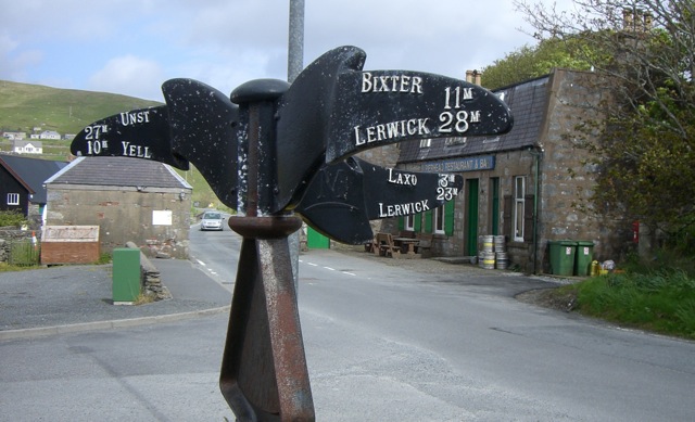 Many ups and downs around Gruting Voe eventually led to Bridge of Walls. I had planned on a circular tour towards Sandness then round to Walls Via Dale of Walls and Mid Walls. I started north east on the A971 and made it as far as the Scord of Brouster before I gave in. I just couldn't face the extra miles against the headwind so turned round and cycled straight to Walls.I immediately went to the shop for supplies then next door to the Baker's Rest Cafe to dry off, I was its only customer. I ordered ham and cheese toasty, chips and tea. The cafe occupied a lovely spot overlooking the village and bay so I could see that there was no ferry at the little terminal, not really a surprise given the wind. The food was very tasty and the cafe excellent, highly recommended. I mooched over to the terminal more in hope than expectation to enquire about the Foula ferry. Apparently it hadn't run for several days so here was confirmation that the Foula trip was off, I was now at a loss what to do. Voe House Böd in Walls was an option for the night so I enquired at the shop for directions. The shop keeper kindly pointed at the Böd for me across the bay. The custodian's phone number was in the window so I went in search of a phone box, first going back to the shop again for change, still no phone signal. I left an answer phone message which was very daft given that the guy couldn't ring me back. A B&B sign gave another option but then I had an idea, use the wind to propel me north east and onwards to Sail Loft Böd in Voe. This would take me on the next leg of my intended plan after Foula anyway, I knew in all likelihood there'd be room and there's a pub over the road! So I set off and for the first time the wind was not a problem, in fact in less than thirty minutes I was back at Bixter. The day before, this route had been so painful forcing stops at every bus shelter, amazingly it zipped by in no time at all. I turned left up the steep hill just before Bixter and enjoyed the wind assistance towards Aith and Voe. The bike sped on, the jet propulsion was wonderful. I was in sunshine, chasing the dark clouds ahead. I had a look at Aith pier and the lifeboat. The East Burrafirth turning passed by then the climb up and over to Gonfirth before the real climb over to Voe. This is really a terrific road, distant views from the top of each summit plus gorgeous coastal scenery. The really tricky bit was the faster than comfortable descent down the hill into Voe itself. |