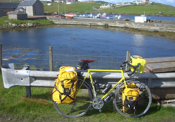 Soon I was back at Hamnavoe and crossing the bridge to Trondra, reaching the mainland bridge in no time at all. Scalloway arrived on the left. As I changed down gears to take the corner and make ready for the hill, I made too many simultaneous demands on the front and rear derailleurs and the chain came off. I pushed the bike round the corner and propped it up on the barrier at the start of the Tingwall road and rethreaded the chain. I chose to go up the hill past the quarry, stopping at various points to take in the view. Due to the wind I stayed on the main road for a free cruise down to the junction by the golf course. Then came the long climb and brilliant descent in a long right hand sweep into Lerwick, no cars passed me on the way down.