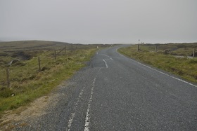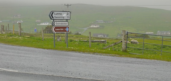 If anything it was getting worse as each wave of darker cloud advanced smartly across the moorland followed by a curtain of intense rain. Eventually I decided to brave the elements and carry on to Lunna, which the road sign declared was only 3 miles away. |