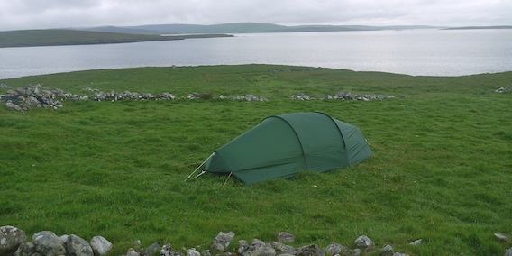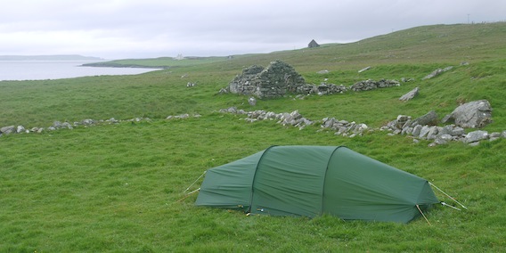 I'd used Google Earth to look for a likely camp site beyond the end of the road, as far as possible with a bike. Ideally this would have been towards the end of Lunna Ness, possibly on the south side depending on the wind. In the event, all I wanted to do was find a sheltered spot, pitch the tent, get out of the rain and dry off.