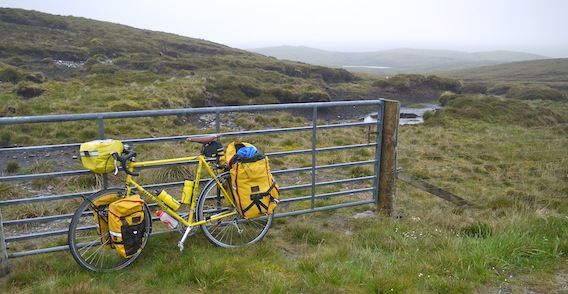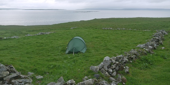 After a quick reconnoitre, I settled on the top corner of a grassy field near to the main building. My Terra Nova Laser Large tent has two long sectional poles for the roof plus a solid pole for each end. These end poles are a pain because they're too long to pack away with the tent as they make the tent bag too big for the panniers. My solution is to carry them separately, fastened to the rear bike rack with elastic bands. Worse is that they're tricky to fit into their little elasticated pockets, which is not helpful when trying to errect the tent quickly in the rain. I put the de-bagged bike in a sheltered corner inside the old croft.