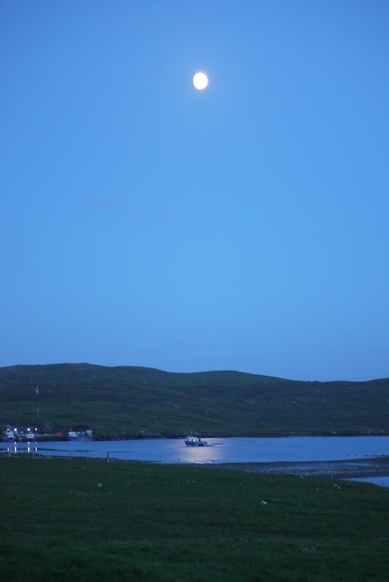 The moon rose higher and one of the fish service boats was caught in the moonlight, reflected in the Voe.
