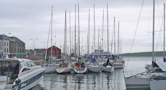The annual Bergen to Shetland yacht race had reached Lerwick that weekend and I was looking forward to seeing the yachts in the harbour. Lerwick town centre was eerily quiet but the harbour was full, the scene dominated by the jazzy monochrome bulk of the flotel 'Sans Vitesse'. |