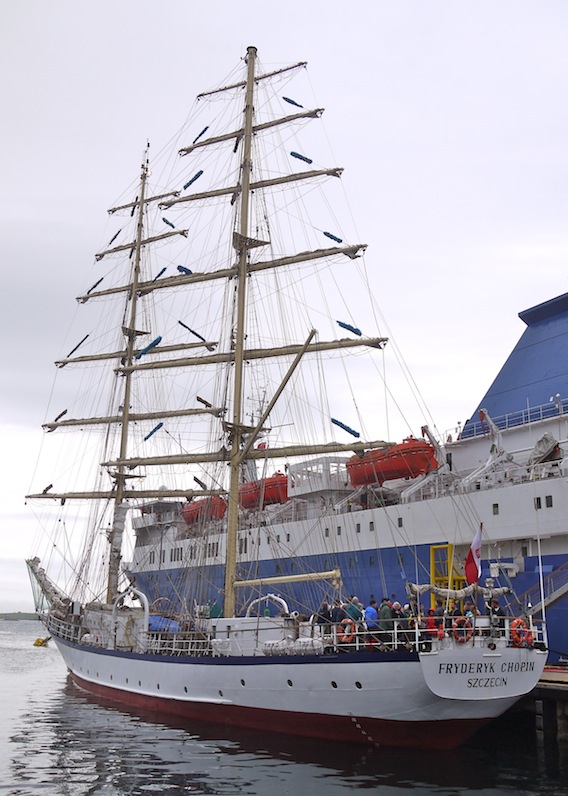 Apart from the Sans Vitesse, there was what I took at first sight to be a blue cruise liner moored at the end of the dock. The 'Ocean Atlantic' looked pretty old and unloved and it dawned on me that it too must be floating accommodation for gas construction workers. There was a tall ship next to it, the 'Frederyk Chopin' registered in Szczecin. A group of people were gathered at the back.