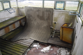 I then struck off left beside a blue industrial shed and up the valley where the circles were situated. They turned out to be five round walls set out in a line in the valley bottom. The next thing to catch my attention was a metal spike pointing to the sky on the horizon up to the left. It wasn't at all obvious what it was. On closer inspection, the fallen rusted wind turbine and its heavenward blade was the first item of dereliction on the hill. The second was the coastguard lookout hut which was in a very sorry state indeed.