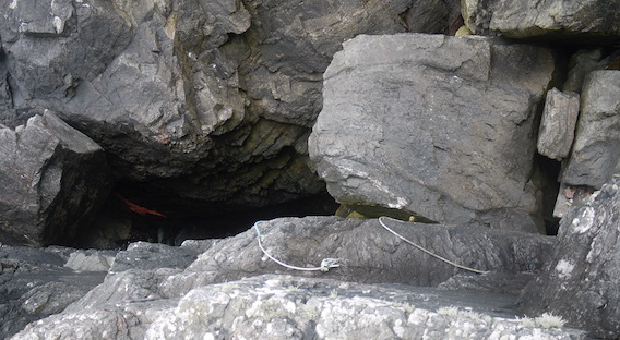 Due to the slight dampness of the rock and my lack of mountaineering equipment, it quickly became apparent that this endeavour was not without an element of danger. I jumped off the ledge onto a boulder and lingered for a while to review my options. I appeared to be on top of a rock fall that had become jammed in the gap. There was still a considerable way down to sea level and the ropes looked decidedly ropey, plus it wasn't clear how I'd ascend the other side, nor find a way back.