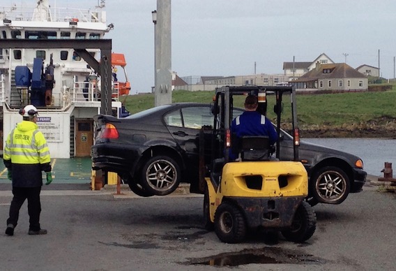 Two women turned up to watch proceedings. One of them was the island's nurse who was in fact from somewhere in Yorkshire and had taken the job on the island to 'escape'. The other woman talked very highly of their nurse and the general improvement in health services since she'd arrived. As we chatted, we watched the fork lift as it picked up a black BMW and unceremoniously plonked it on the car deck; apparently its suspension had collapsed. The car was ratchet strapped down and looked in a very sorry state indeed. |