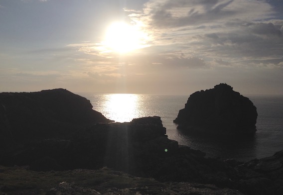 A mooch around revealed a rugged coastline with a deep gorge cut into the rock on the right hand side of the field. It really was too warm to work and the main concern was sun burn. Still, the solar battery was receiving a strong charge. Eventually I got my act together and began to erect the tent, even if it would be far too warm to get in.