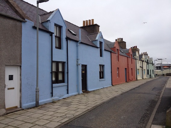 I was heading back towards the Scalloway Museum and found myself going along New Street with it's pretty pastel coloured terrace houses. The most remarkable thing however was the incongruous cruise ship at the end of the road. |