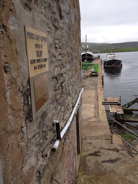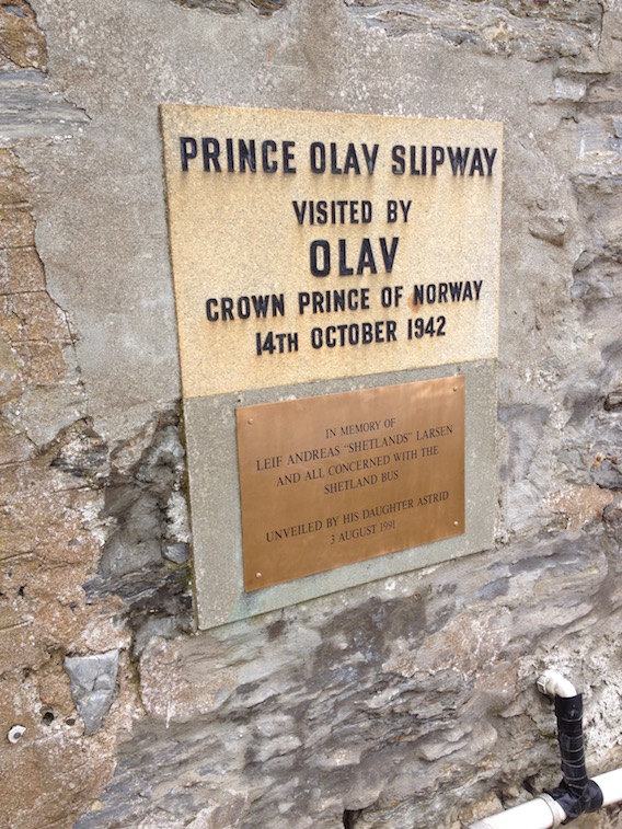 Further along Main Street is the Prince Olav Slipway which was used during the war. There are two plaques on the wall. The top one records the visit of Prince Olav Crown Prince of Norway in October 1942 and the bottom one is in memorial of Leif Larsen and all involved with the Shetland Bus, which was unveiled by his daughter Astrid in 1991. |