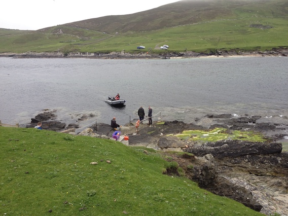 The crossing back across the Sound was even more hairy, to the point where I wondered if the Noss ferry had ever lost any passengers. The issue was landing on the other side, which in my case, involved a few aborted attempts accompanied each time by a 'whoops, maybe we should try that again' and the application of full power to take us back around. I had every sympathy as the current was running fast and judging the wave to come in on, called for a good deal of expertise on the part of the guy at the helm. On perhaps the fourth attempt, we made a solid approach and I leapt out narrowly avoiding a drenching by the next wave. All in all a very momorable experience. I handed back my life jacket and climbed the bank to take some photographs.